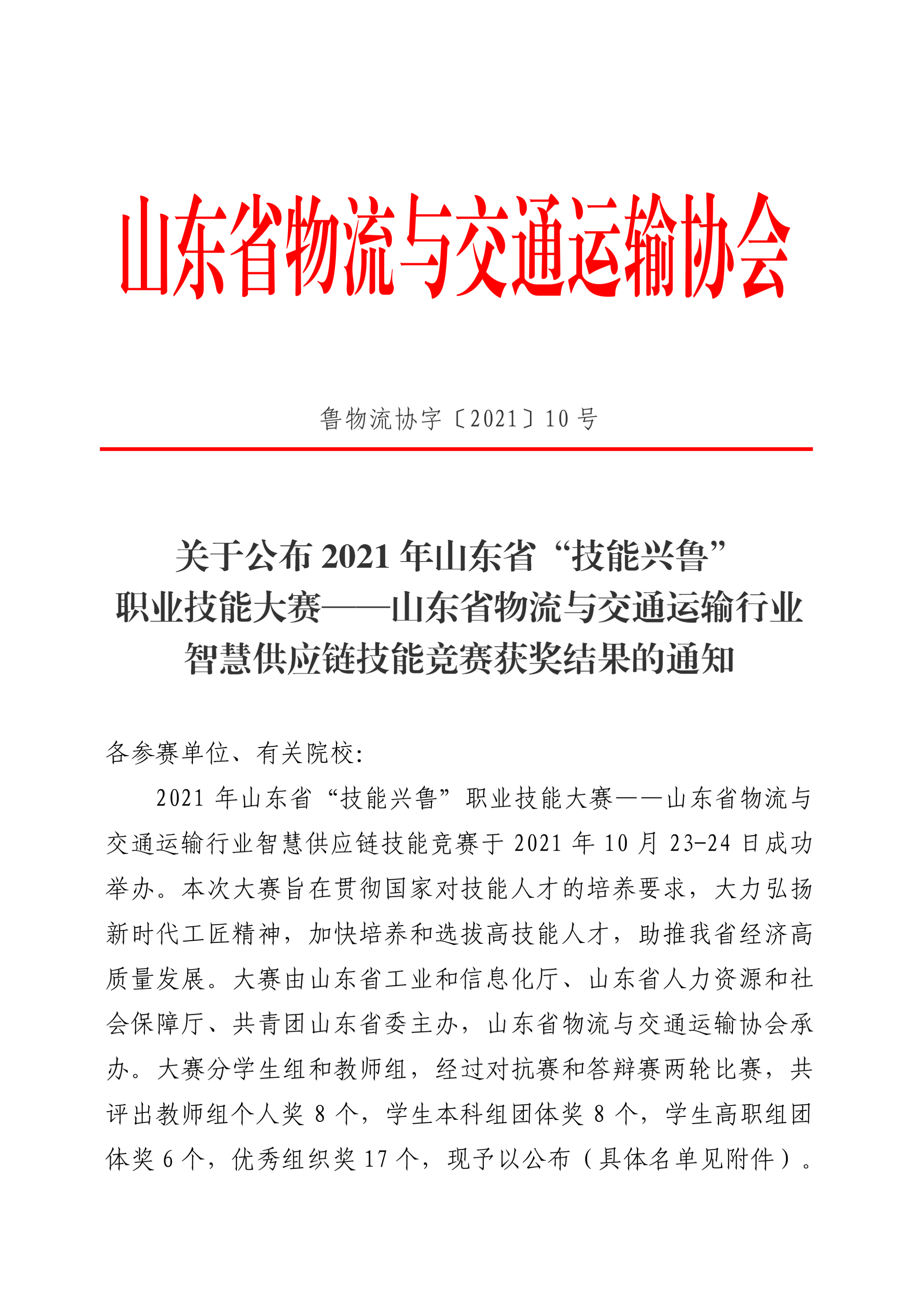 关于公布2021年山东省“技能兴鲁”职业技能大赛——山东省物流与交通运输行业智慧供应链管理技能竞赛获奖结果的通知