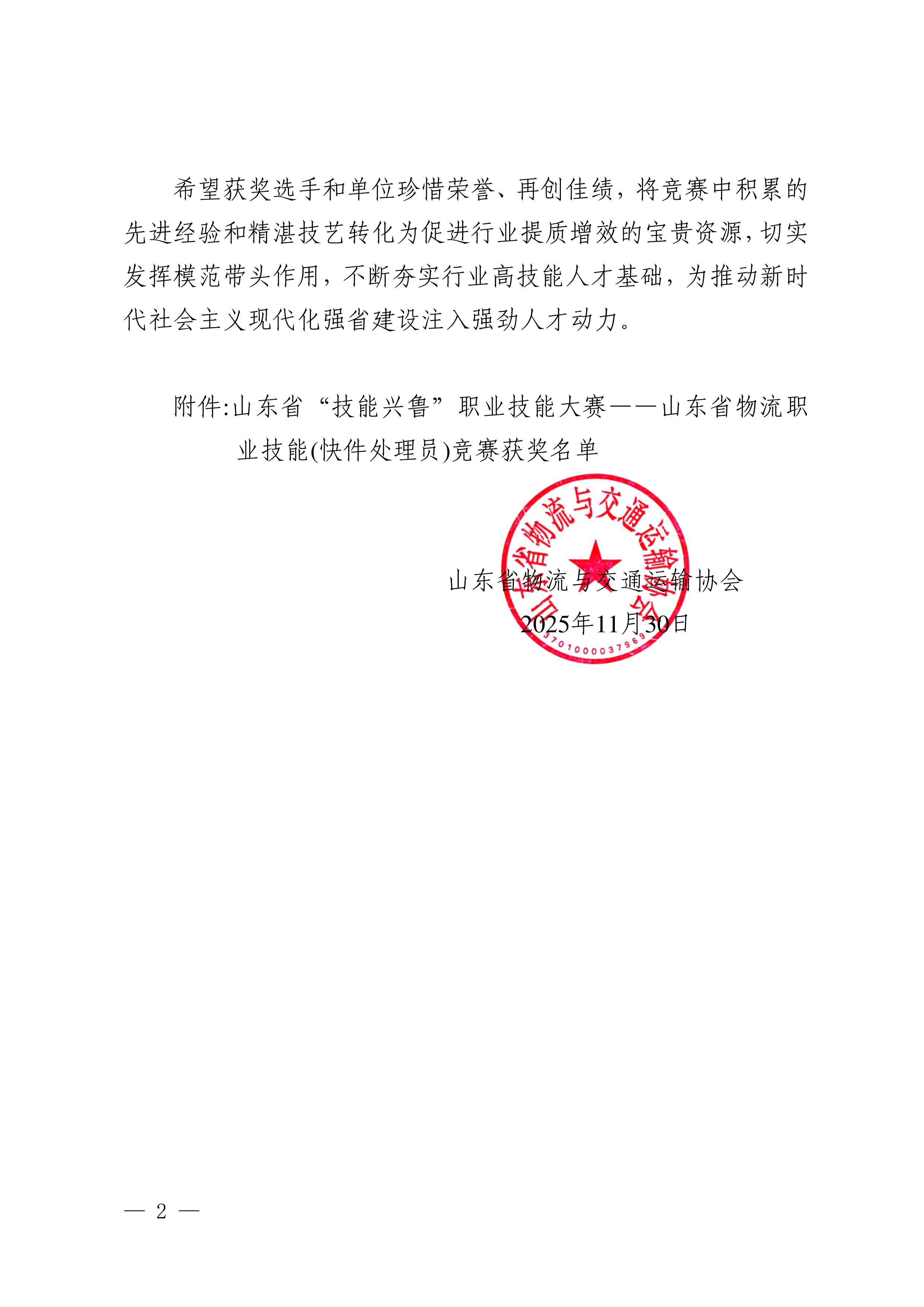 关于公布山东省“技能兴鲁”职业技能大赛——山东省物流职业技能(快件处理员)竞赛获奖情况的通知