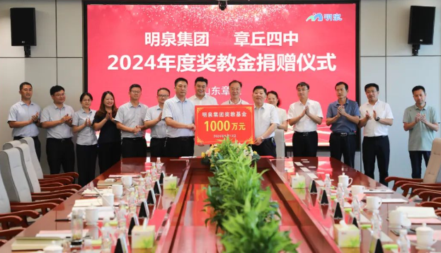 明泉集团出资1000万元,设立“明泉集团奖教基金”,作为长期的捐赠方式,自今年开始,每年向章丘四中捐赠100万元,用于支持教育事业发展。章丘四中教育集团集小学、初中、高中三个阶段,不断创造着名校录取和一本上线人数的新记录。自2018年以来,明泉集团每年向章丘四中捐赠奖学金,用于支持章丘四中教育事业发展。从奖学金到“明泉集团奖教基金”,是明泉贯彻“百年企业、辉光日新、惠及员工、回报社会”发展愿景的具体举措,是明泉践行中华优秀传统文化“仁者爱人”“博施济众”思想的实际行动。