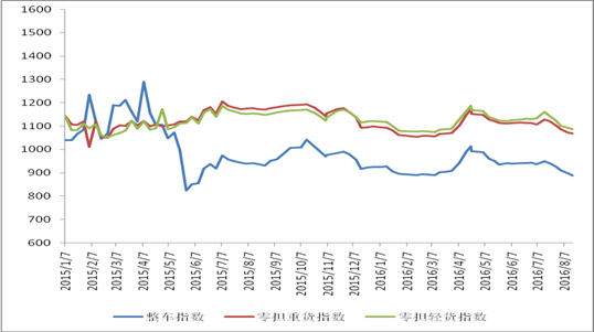 各车型指数环比有不同程度回落,其中整车指数回落幅度高于零担指数,零担轻货指数回落幅度高于零担重货指数。本周,整车指数为888.0点,环比回落1.1%,比上年同期下降4.1%;零担重货指数为1067.4点,环比回落0.5%,比上年同期下降9.1%;零担轻货指数为1086.5点,环比回落0.6%,比上年同期下降5.7%。