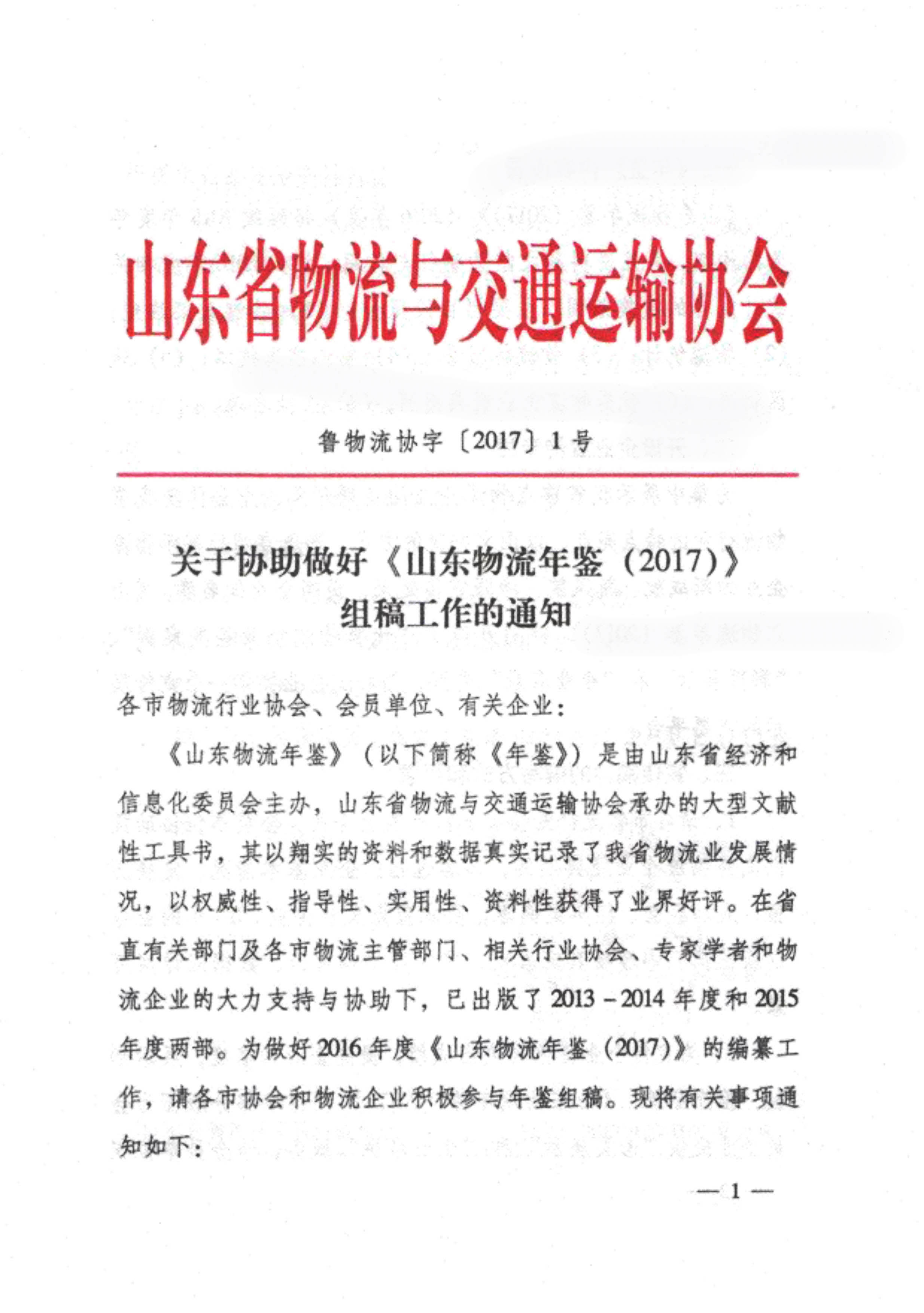 关于协助做好《山东物流年鉴(2017)》组稿工作的通知