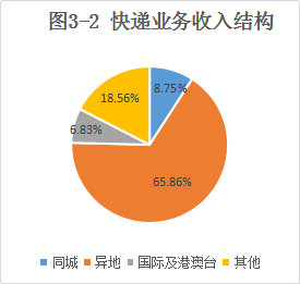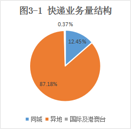 1-11月,同城、异地、国际/港澳台快递业务量分别占全部快递业务量的12.45%、87.18%和0.37%;业务收入分别占全部快递收入的8.75%、65.86%和6.83%。与去年同期相比,同城快递业务量的比重下降2.09个百分点,异地快递业务量的比重上升2.24个百分点,国际/港澳台业务量的比重下降0.15个百分点。