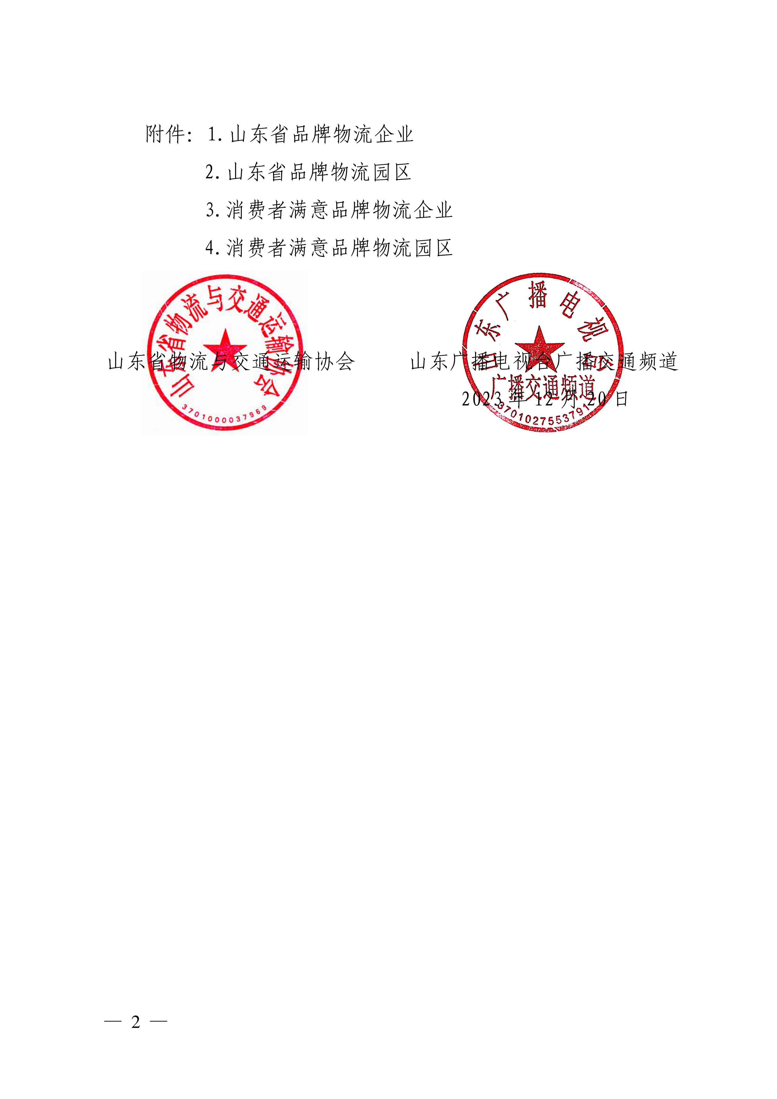 关于公布山东省品牌物流企业和品牌物流园区推选结果的通知