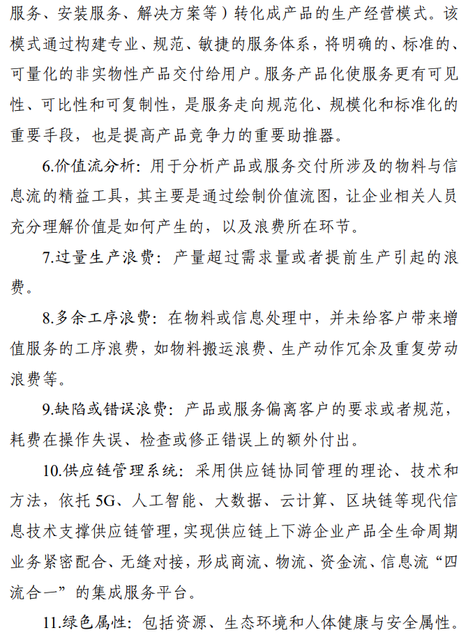 (五)消除供应链各环节浪费。企业可灵活运用成本总量核算、价值流分析等方式,精准识别供应链全过程中的过量生产浪费、多余工序(物料搬运距离、生产动作冗余、重复劳动等)浪费、缺陷或错误浪费、库存浪费等内容,及时分析查找原因,采取必要的监测预警手段,实施提高周转速度、减少流程差异等改进方法来消除浪费,实现资源的最优配置。