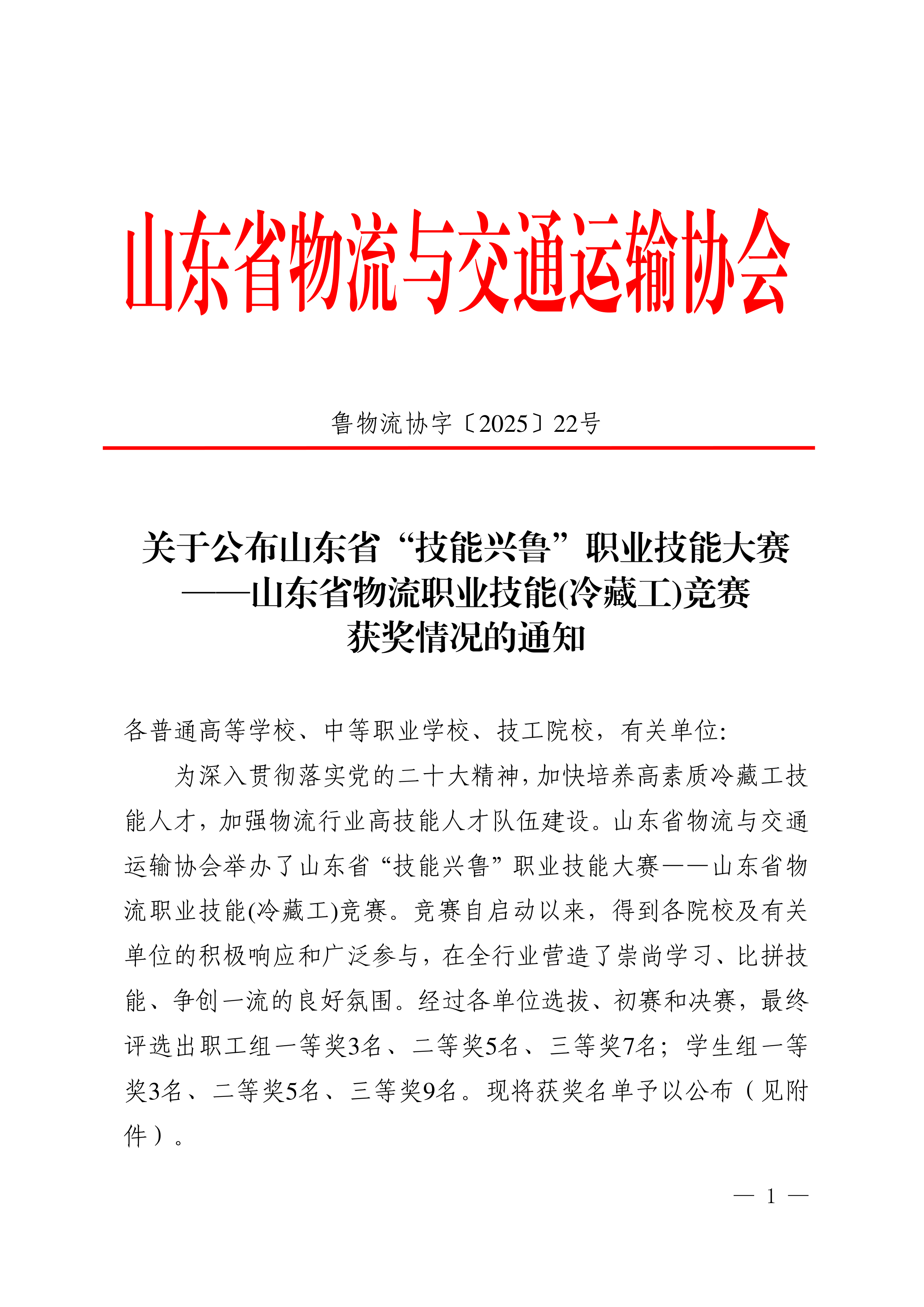关于公布山东省“技能兴鲁”职业技能大赛——山东省物流职业技能(冷藏工)竞赛获奖名单